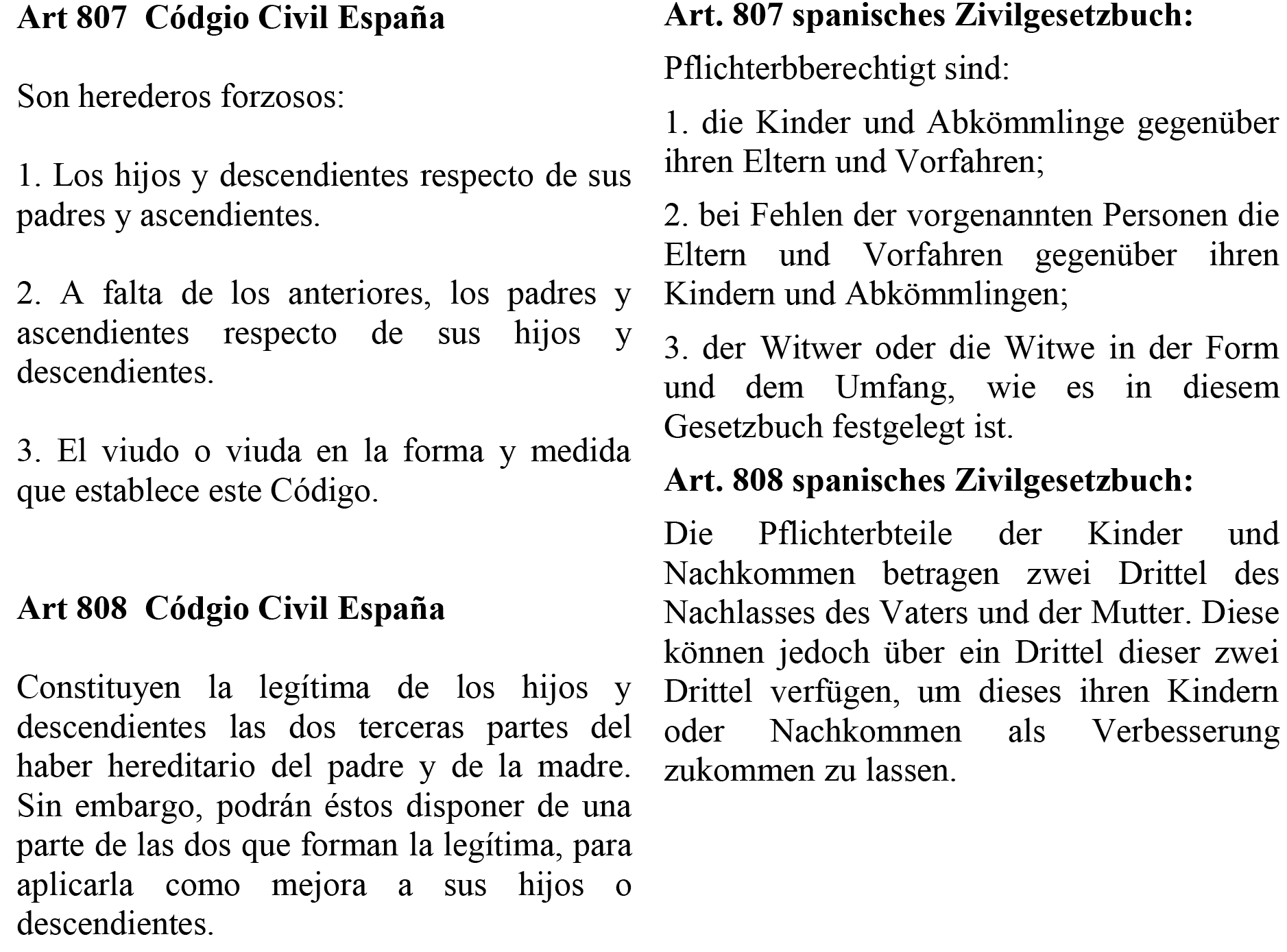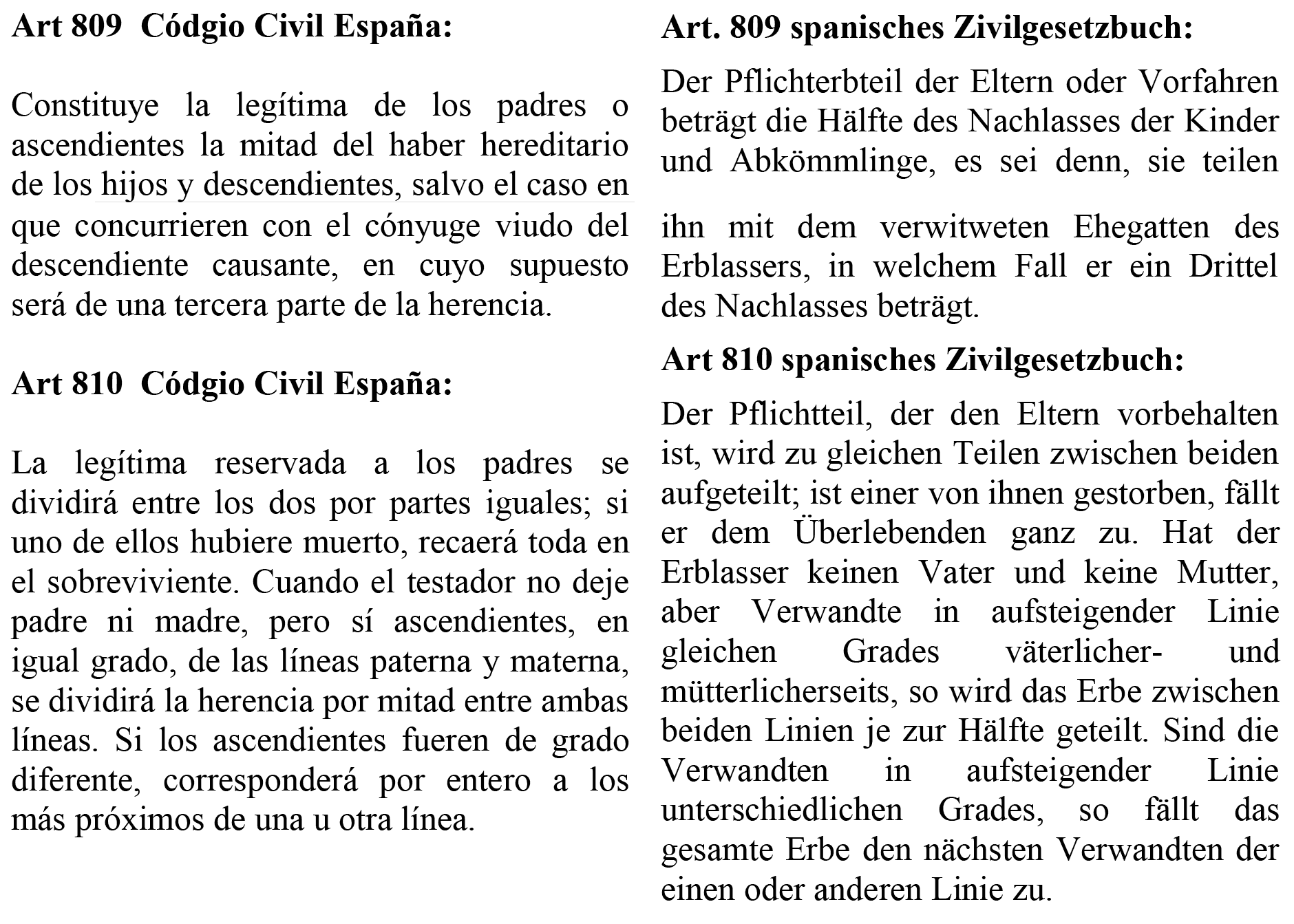 Wird der Erblasser nicht von Kindern oder anderen Abkömmlingen beerbt, haben nach Art. 807 Ziff. 3 CC (Códgio Civil, spanischen Zivilgesetzbuches) die Eltern und andere Vorfahren (Aszendenten) ebenfalls einen Pflichtteil.